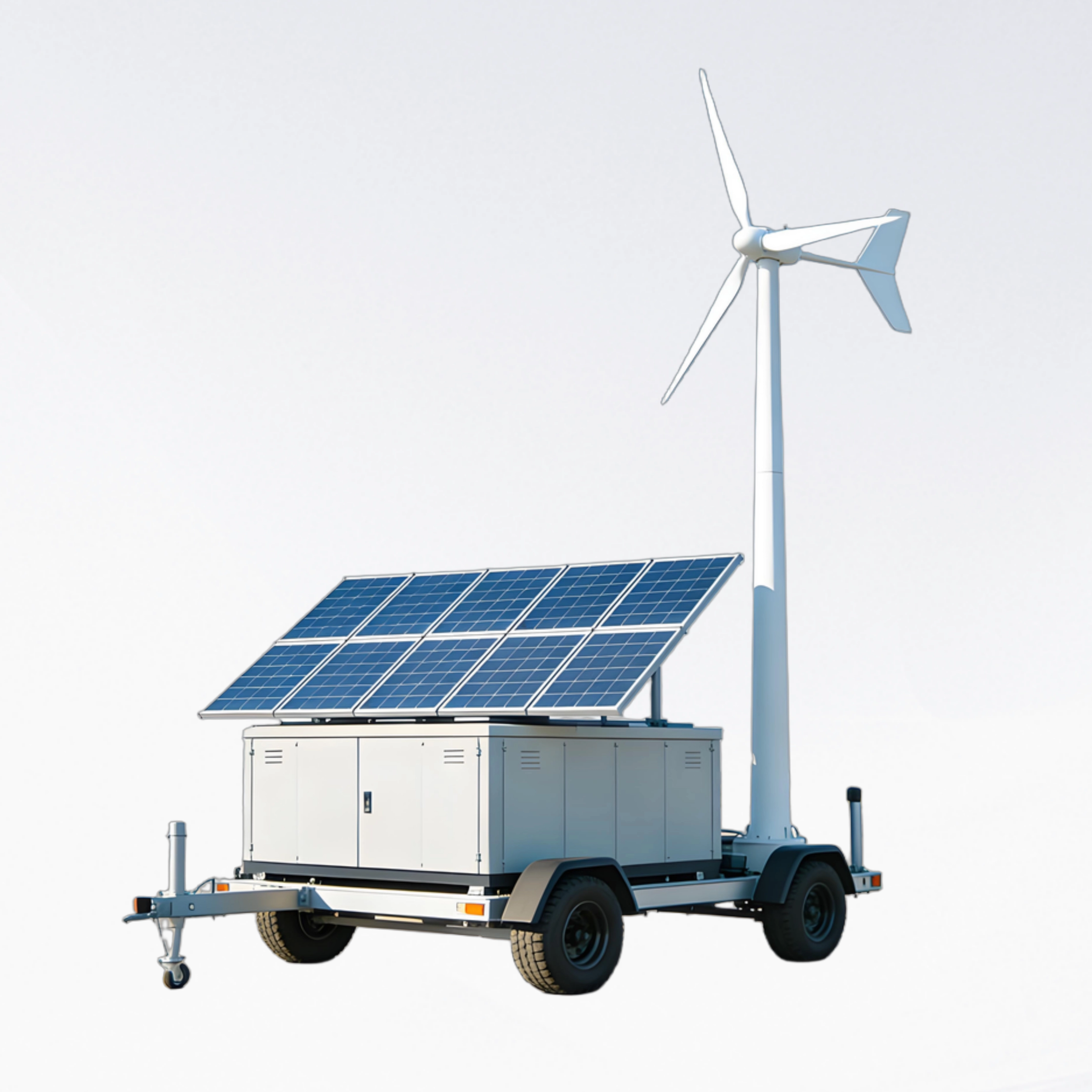 答:每周清洁光伏板和风机表面灰尘,每月检查拖车和塔架的紧固件。电池内置BMS管理,无需额外维护。